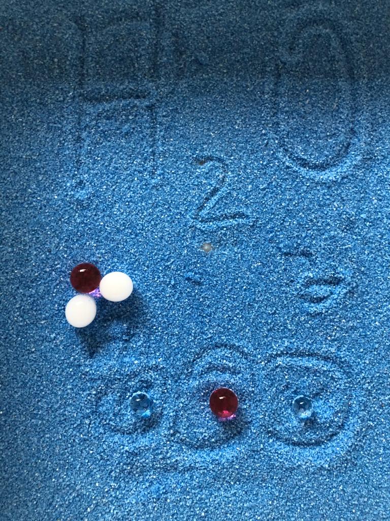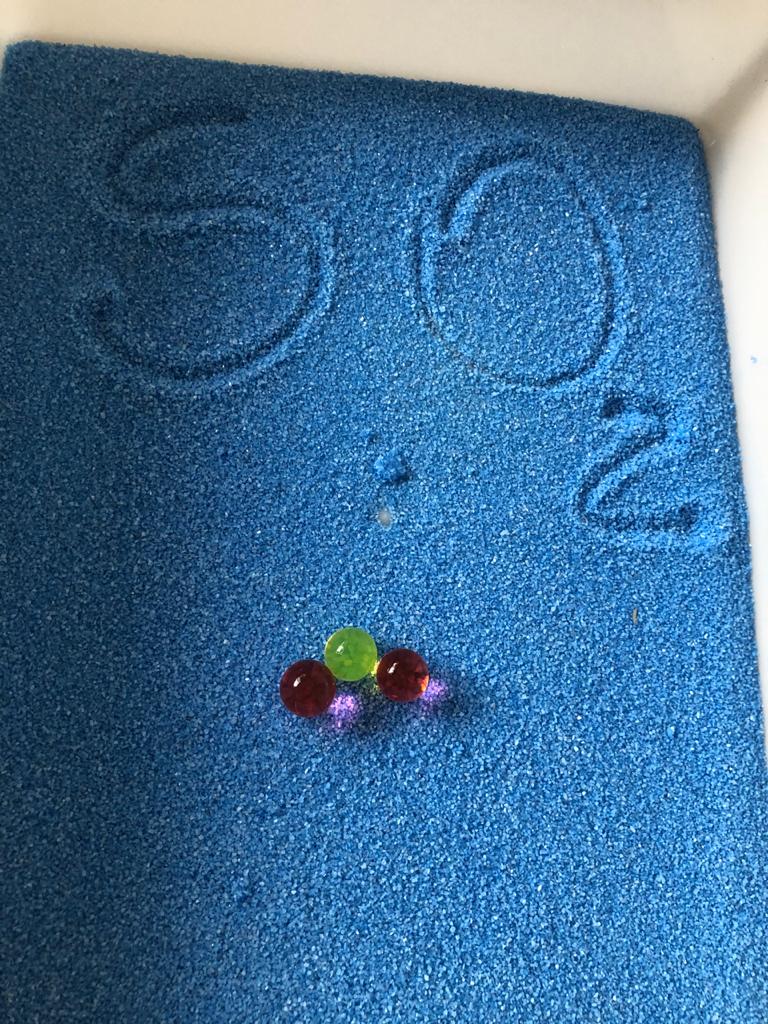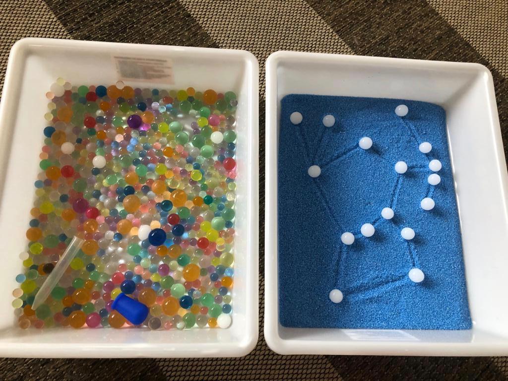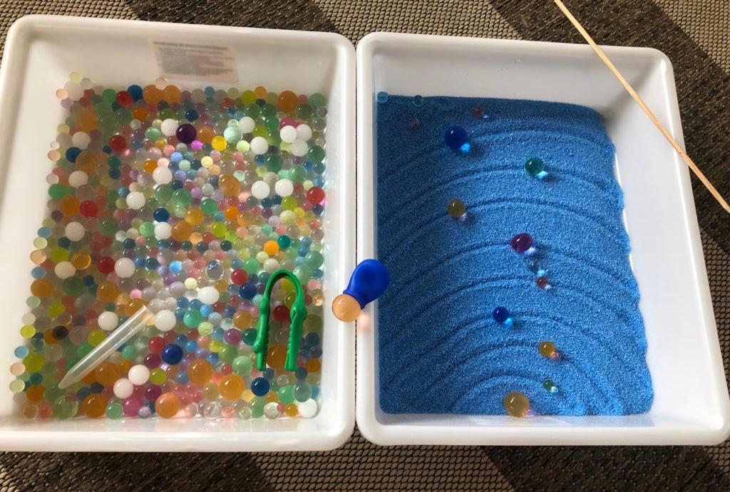 Utilizamos bolinhas de gel que havíamos hidratado semana passada, areia colorida, conta-gotas jumbo, pinças.