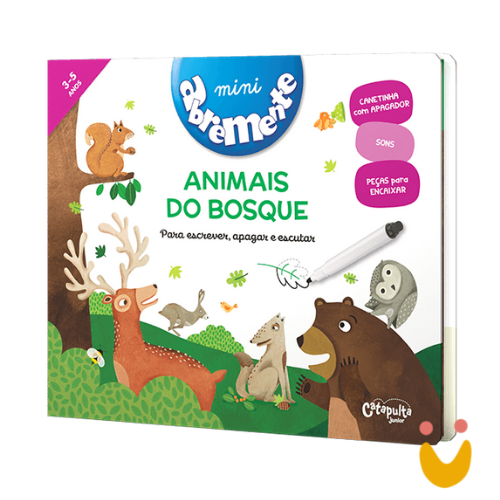 Escrever, apagar e começar as atividades lúdicas novamente é uma das características do livro “Animais do bosque” que complementam a coleção Abremente e oferecem histórias infantis, atividades educativas e experiência sensoriais.