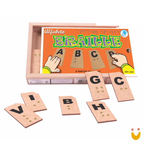 Este material de apoio auxilia no aprendizado do alfabeto em Braille, possibilitando a construção de diversas palavras.