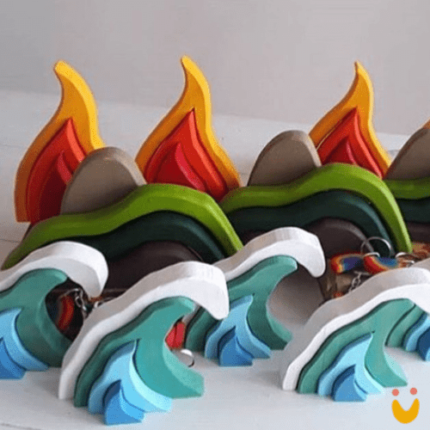 Quebra-cabeça de madeira 3D com peças em formatos, tamanhos e cores variados, medindo aproximadamente16x30x4,5cm, encerado com cera de abelha.