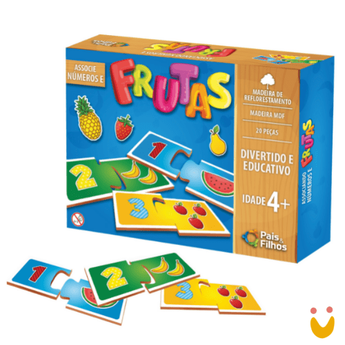 Quebra cabeça de associações de números e frutas.