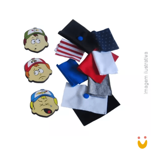 Contém: 01 caixa em madeira com ilustração de personagem feminino, medindo 245mm x 145mm x 50mm, com 04 expressões de rosto para ser trocado conforme o vestuário e peças de tecidos com cores e estampas variadas para compor o figurino.