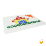 Painel de tamanho aproximado 32×24 com encaixes para argolas e encaixe para colocar ficha com atividades e desenho de figuras na parte inferior permitindo a cópia da figura com as argolas.