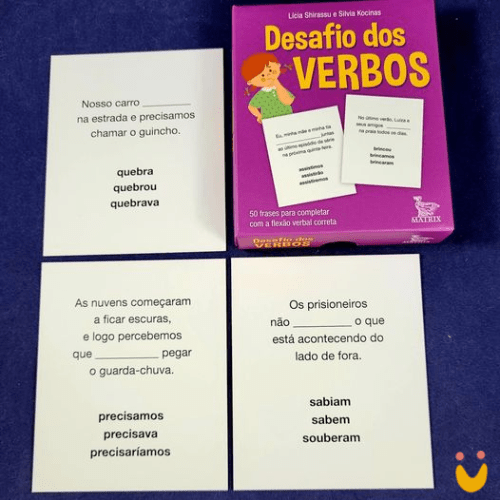 Este Recurso Terapêutico é um livro em forma de caixinha traz 50 cartas, cada uma com uma frase e três opções de flexão verbal.