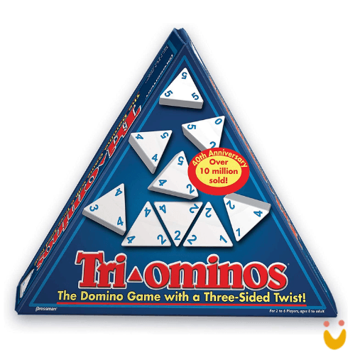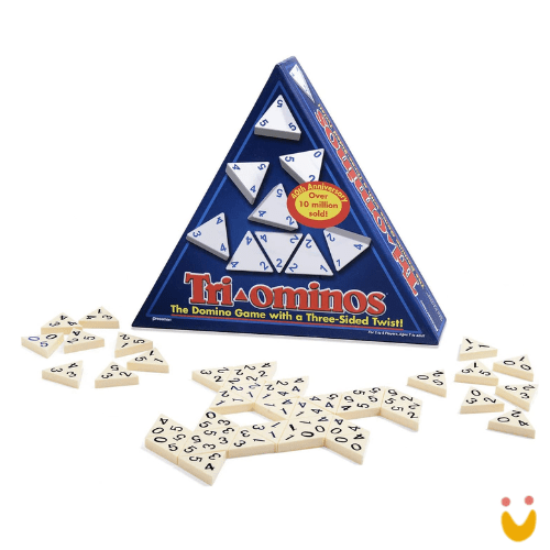 No Tri-Ominos, as peças triangulares têm um número em cada canto, então os jogadores devem combinar dois números em uma peça, adicionando uma nova dimensão à jogabilidade. Cada jogo consiste em várias rodadas onde os jogadores usam uma combinação de habilidade e sorte para marcar.