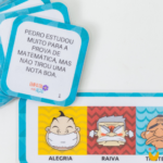 O jogo contém 36 cartas com situações e uma régua com a representação das emoções: ALEGRIA, RAIVA, TRISTEZA, MEDO e ANSIEDADE