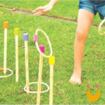 Brinquedo para jogar ao ar livre. Crave as estakitas na terra ou grama, podendo ser colocadas uma ao lado da outra ou espalhadas, e tentar de uma determinada distância arremessar as argolas nas estakitas.