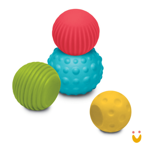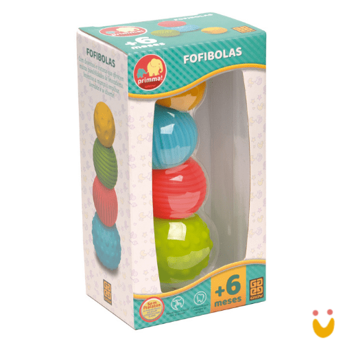 São quatro esferas com diferentes texturas, cores e tamanhos. Fofibolas tem um desenho fofo que permite brincar de empilhar e derrubar as bolinhas, a fim de estimular o raciocínio lógico e a percepção dos sentidos conforme ao crescimento da criança.