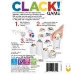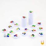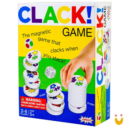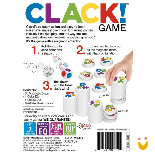 Estrelas amarelas! Relâmpagos vermelhos! Pegadas azuis. Onde eles estão? Espalhe os discos magnéticos, jogue os dados e embaralhe para combinar a imagem e a cor. Faça uma partida, pegue um disco e use seu claque magnético para construir uma pilha. Manter a pontuação é fácil – basta alinhar as pilhas para ver qual torre é mais alta.