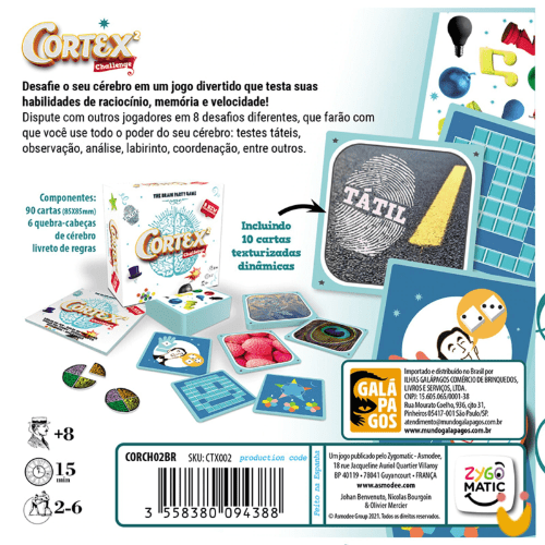 Cortex Challenge 2 é o jogo ideal para reunir os amigos e a família em volta da mesa e colocar todo mundo pra usar 100% do cérebro (ou 50, ou 30, tanto faz). Além disso, é sucesso garantido com adultos que querem testar suas capacidades cognitivas e também com crianças, desenvolvendo a memória e o raciocínio dos pequenos.