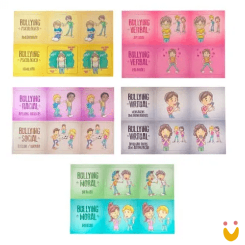 Bullying é um termo da língua inglesa (bully = valentão) e denomina um conjunto de atitudes agressivas realizadas a outro (s), de maneira consciente, por uma ou mais pessoas, de forma repetitiva e sem motivo concreto, caracterizando-se por agressões verbais, físicas e psicológicas, insultos, apelidos, intimidações, acusações sem veracidade, exposição ao ridículo, ofensas, fazendo com que a vítima tenha danos, tanto psíquicos, quanto físicos, morais, materiais e emocionais, a levando à exclusão. O bullying pode acontecer em qualquer ambiente no qual existe contato interpessoal, seja na escola, no clube, na igreja ou na própria família. O material traz ótimos benefícios, como desenvolvimento do raciocínio rápido, da noção espacial, da memória fotográfica, favorece a socialização, a empatia e ajuda o educador, os profissionais da saúde e as famílias a apresentarem de maneira mais leve as formas de bullying, buscando a reflexão sobre comportamentos saudáveis e não saudáveis, prevenção e uma cultura de paz.