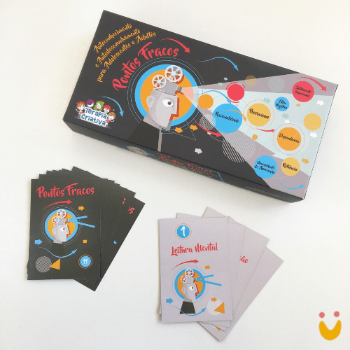Autoconhecimento e  Autodesenvolvimento para Adolescentes e Adultos –  é um recurso terapêutico para o trabalho com adolescentes e adultos. São 35 cartões com afirmações que refletem pensamentos e comportamentos disfuncionais e questões para desconstruir essas regras de forma a promover mudanças na direção desejada, ou seja, construir comportamentos e reações mais assertivas e adaptadas ao contexto atual de vida.