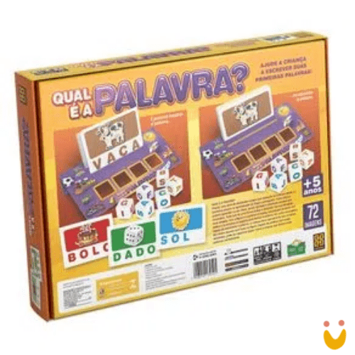 Qual é a Palavra? Propõe várias formas de brincar e se divertir, acompanhando o ritmo da criança e ensinando-a a dar os primeiros passos no aprendizado da língua portuguesa. O objetivo é procurar as letras nos dados e encaixá-los no suporte para formar a palavra desejada.