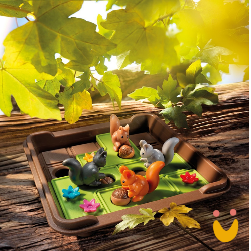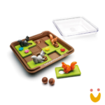 O jogo contém: 1 base de jogo, 5 bolotas, 5 peças com formas diferentes e um livro com desafios e soluções; livro com 60 desafios.