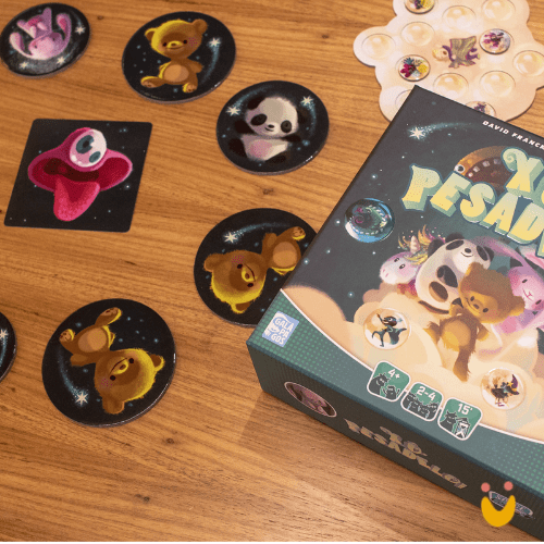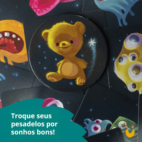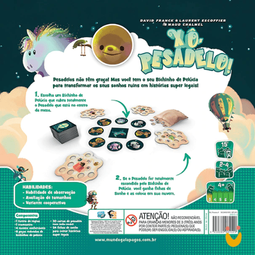 Contém: 1 Livro de regras, 1 Bolsa-almofada, 4 tabuleiros, 8 cartas de pelúcia, 30 cartas de pesadelo, 54 peças de sonho