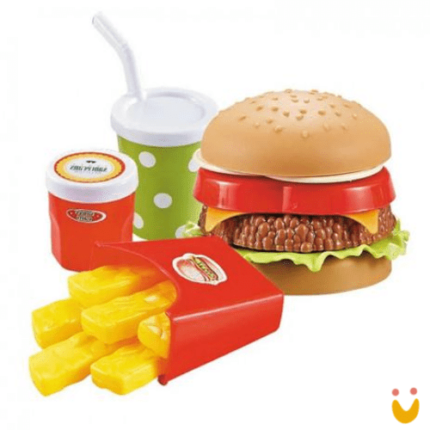 Este kit contém: 1 banana, 1 goiaba, 1 laranja, 1 mamão, 1 fatia de melancia, 1 faca e 1 tábua de corte.