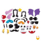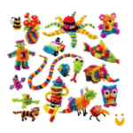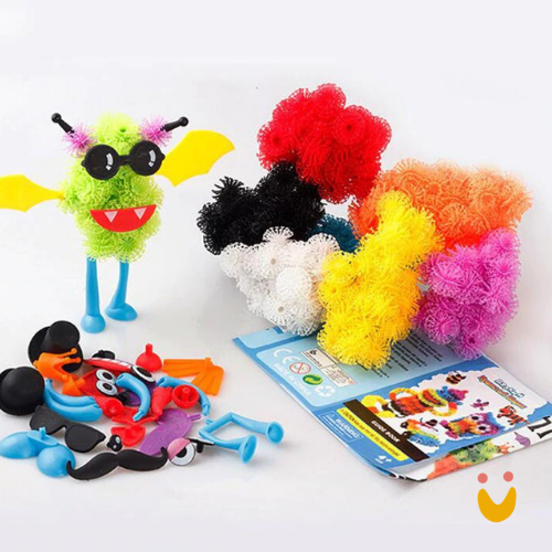 O Kit é composto por 400 peças contendo acessórios e bolinhas de aproximadamente 1,5cm, com mini garrinhas que se encaixam uma na outra, formando personagens divertidos.