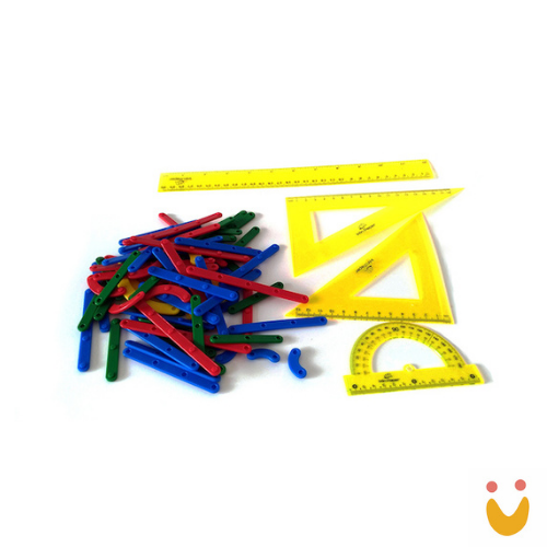 Kit com 78 peças em plástico sendo algumas retas (tipo palito de sorvete), em três tamanhos, contendo três, quatro ou cinco furos em cada peça e peças circulares (1/4 de circunferência), também com dois, três ou quatro furos, encaixáveis e em tamanhos diferentes, (conforme o número de furos), para formar o contorno de figuras geométricas planas e estudar propriedades. De um lado vem o furo e do outro lado um pino para encaixe em outra peça. (Criação da MMP). Tamanhos das peças entre 1x5cm (3 furos) a 1×11 cm (5 furos). Total 78 peças. Em cores diferentes.
