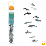 Nesse tubo você encontrará um modelo das baleias: azul, beluga, cinza, assassina, cachalote e jubarte, um golfinho de nariz branco, comum, manchado e pacífico e, por último mas não menos importante, um narval!