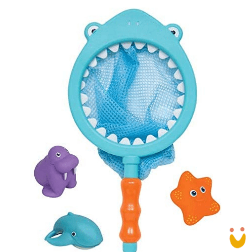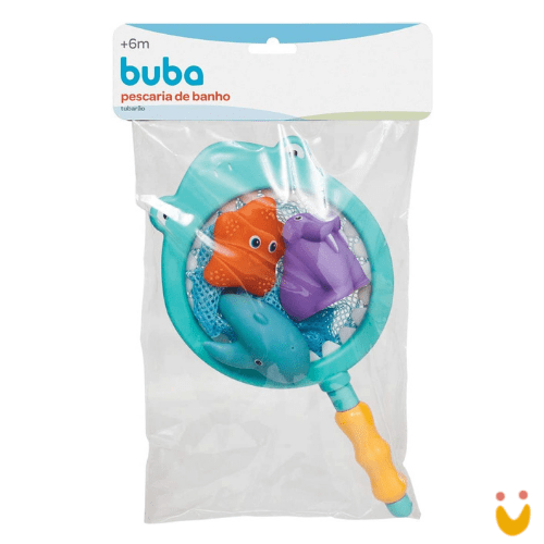 Vem com 3 bichinhos diferentes sendo 1 baleia, 1 leão marinho, 1 estrela do mar (que muda de cor na água quente) e 1 rede Tubarão para pescar e engolir os bichinhos.