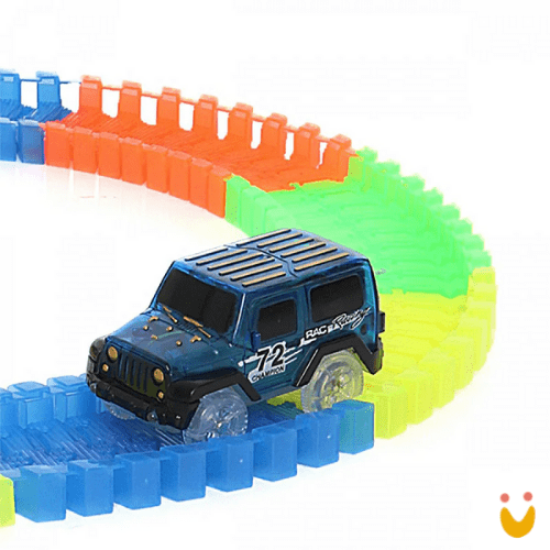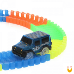 Conecta facilmente um trilho ao outro e ainda acompanha um carrinho com luz de led.