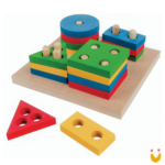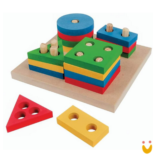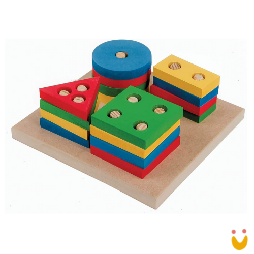 Desenvolve os primeiros conceitos de cor, tamanho, forma. Através da seleção, as crianças aprendem a nomear e identificar as formas geométricas, estimulando a coordenação viso motora.