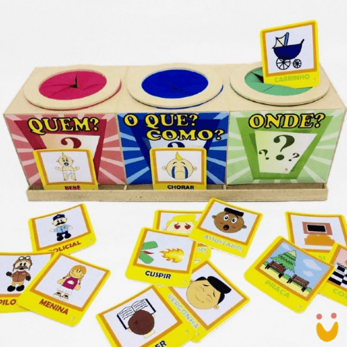 Vem caixa com 3 furos revestida de EVA em madeira, 84 figuras divididas em pessoas, ações, lugares e sentimentos.
