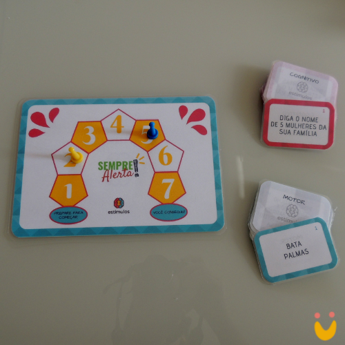 Contém: 1 tabuleiro A5, 16 cartas com comandos motores (azuis), 32 cartas com comandos cognitivos (rosa), 2 fichas, Embalado em pasta ZIP