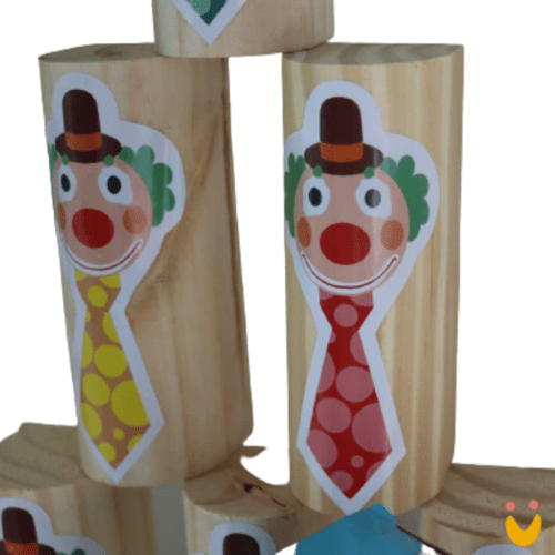 Contém: 10 blocos com cara de palhaço de madeira e duas bolas.