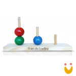 01 Base medindo 278mm x 60mm x 12mm, com três hastes e três esferas de 40mm de diâmetro cada, nas cores verde, azul e vermelha. 01 conjunto de fichas com 15 problemas e 01 ficha posição inicial em MDF medindo cada 70mm x 60mm x 3mm.