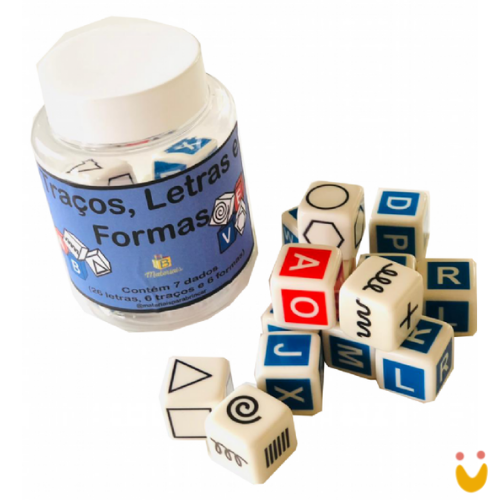 Contém 7 dados que vão da pré-grafia, formas até as letras. (26 letras, 6 traços e 6 formas geométricas)