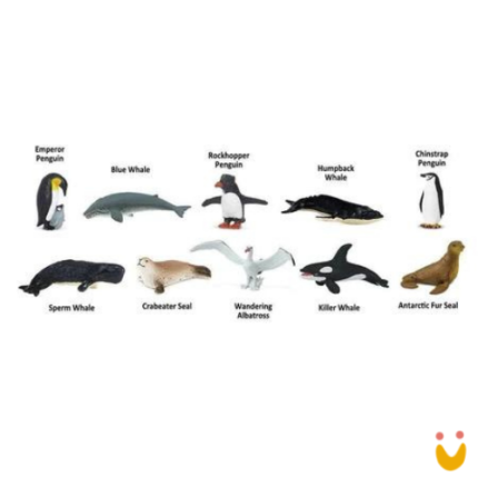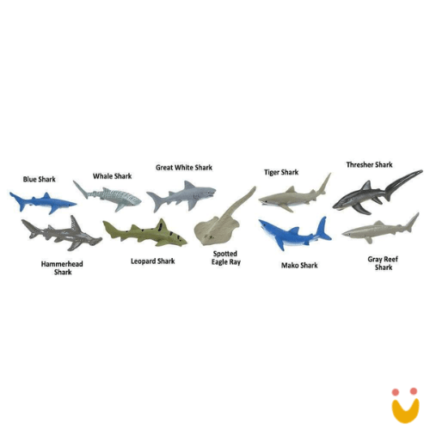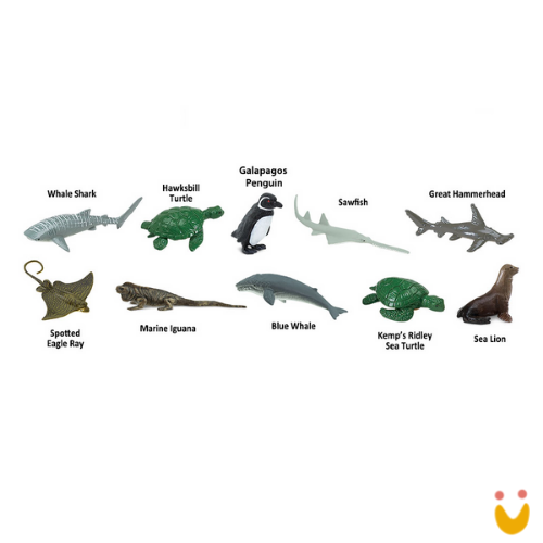 Este Toob contém uma baleia azul, tubarão-baleia, iguana marinha, tartaruga-de-pente, pinguim de Galápagos, leão-marinho, raia-pintada, peixe-serra, tartaruga marinha Kemp’s Ridley e um grande tubarão-martelo.
