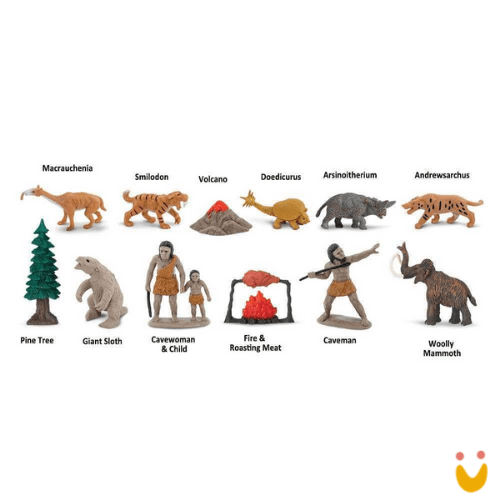 Características: Este conjunto contém 12 peças, incluindo um homem das cavernas, mulher das cavernas e criança, carne de fogo e assar, pinheiro, vulcão, mamute-lanoso, Andrewsarchus, Doedicurus, Arsinotherium, Macrauchenia, Smilodon e uma preguiça gigante.